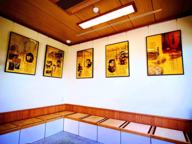 西茶屋の観光駐車場の休憩所には、この周辺に関係のある著名人のパネル展示があります。江戸時代から昭和まで活躍した場所、金沢の西エリアに纏わるエピソードが紹介されています。
