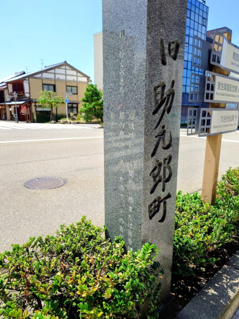 金沢外環状道路(山側幹線道路、海側幹線道路)を東西に連絡する広域的な幹線道路である「野田専光寺線」(昭和5年に都市計画決定)の「野町広小路交差点」から西方向一つ目の「押しボタン式信号機」傍に「旧助九郎町」と刻まれた石柱(まちしるべ)があります。