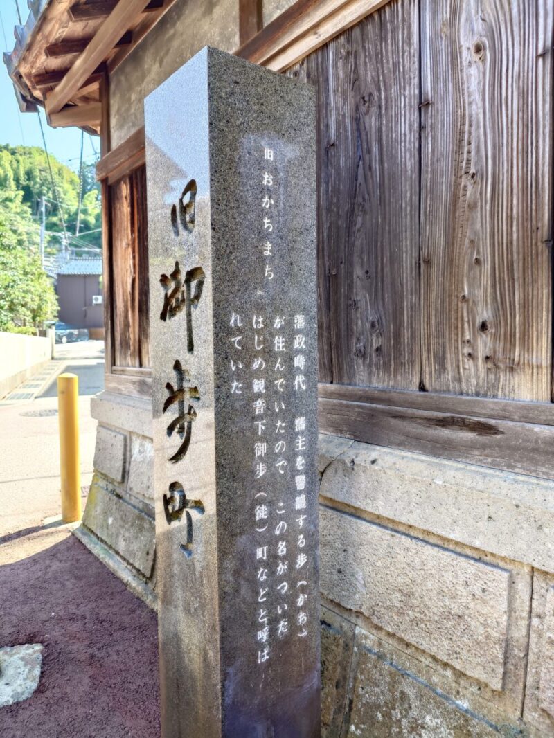 金沢市の東山地区に「旧 御歩町=おかちまち」を示す石柱が建っています。由来の説明文には「藩政時代藩主を警護する「歩=かち」が住んでいたので、この名がついた。はじめ観音下御徒(歩)町などと呼ばれていた」と記されています。