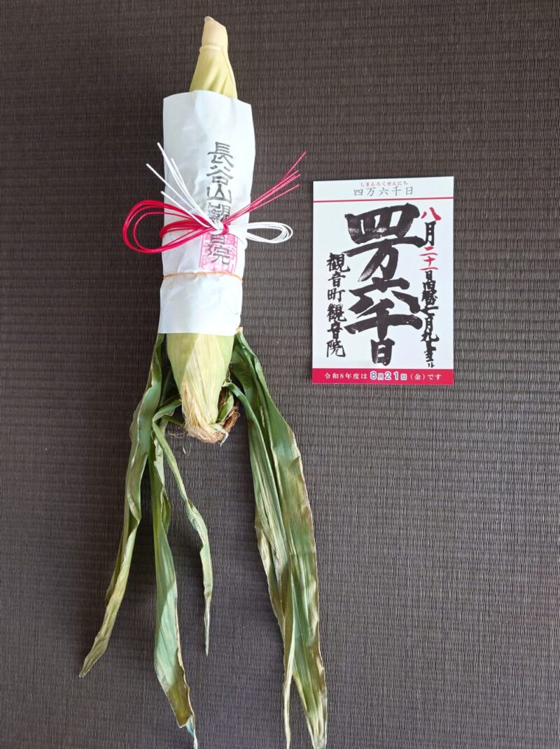 お参りを済ませての帰り道、「観音通り」にあるお店などの軒下には、縁結びの紅白の「水引」を結び、青々とした「トウモロコシ」が飾られ、時折吹く爽やかな風に揺れていました。