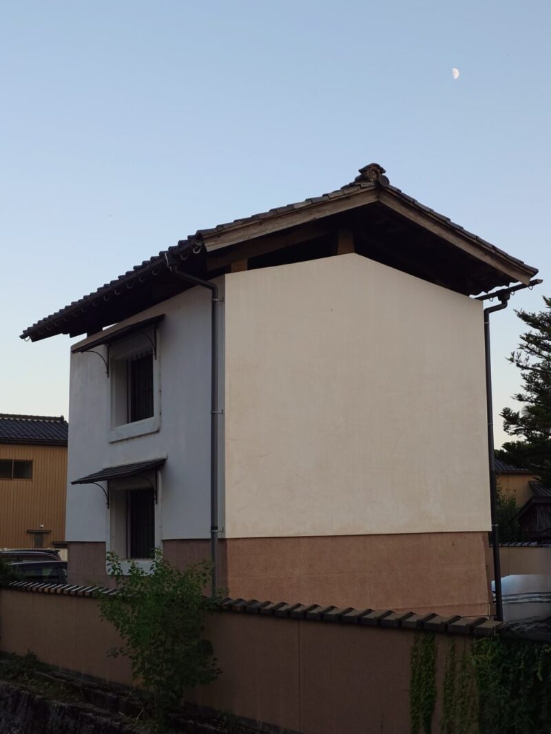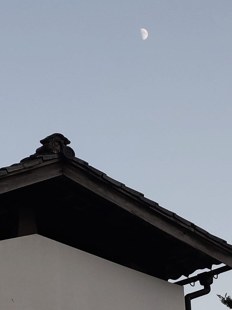 分厚い土壁で構成される「土蔵」本体の上に、もう一つの屋根を乗せた二重構造の建物に目をやると、空には「月」が・・・・。