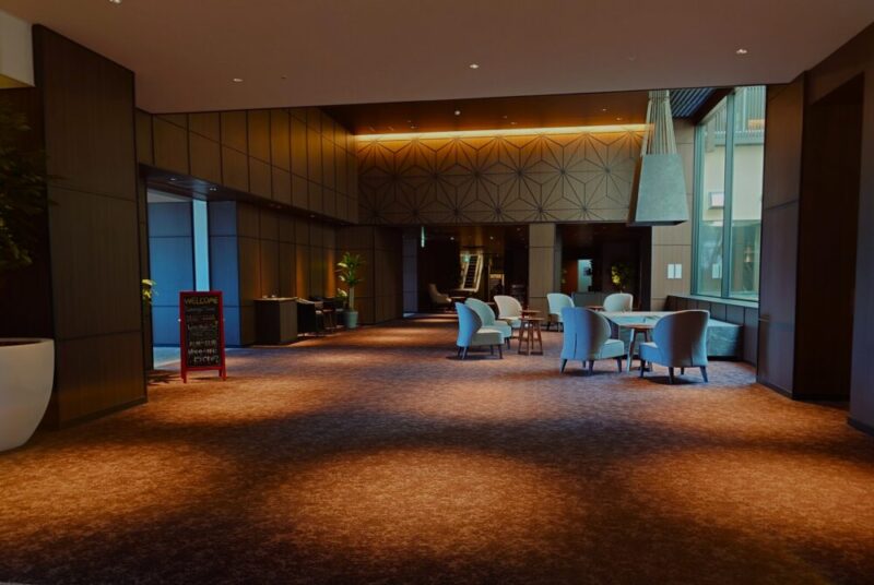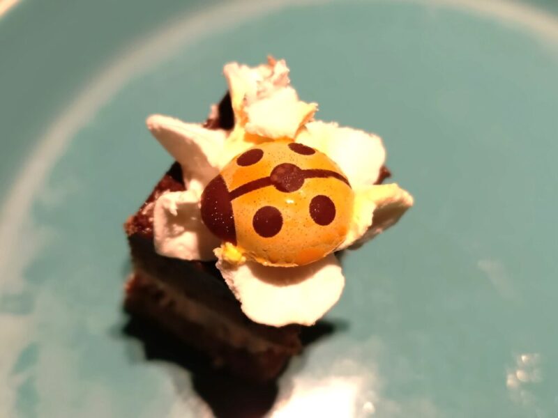 二枚目の写真は、復旧工事が完了し今回宿泊したホテルのロビー風景、三枚目の写真は「てんとう虫」に見立てたスイーツ」・・・豊富な料理とお酒を楽しんだ一日でした。