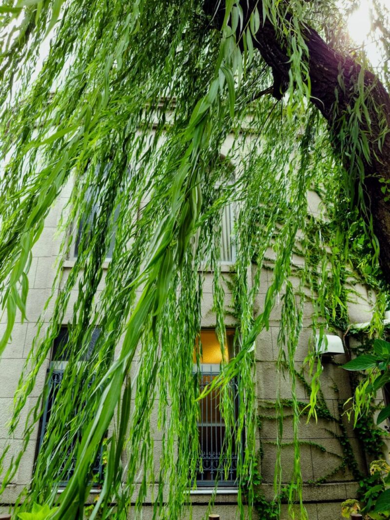 古い舘と濃い緑の柳の木、枝葉が風に揺られて、ゆらゆら揺れる際に、時折見えるオレンジ色の光(窓明かり)がとても綺麗だったので、思わず「パチリ!!」ました。