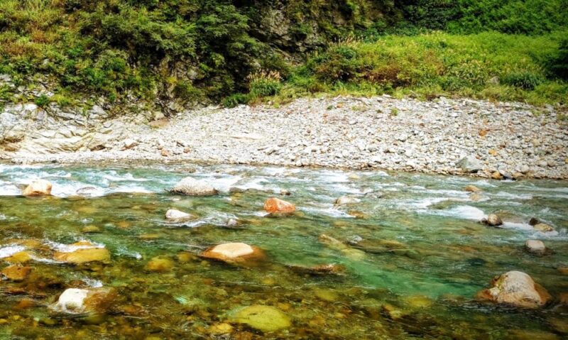 手取川の河川敷を散策、緑色・青色など場所によって何色もの水の色、微妙に違っていて楽しめます。ところが、大小の岩にぶつかると、流れる水は必ず白に変わります。