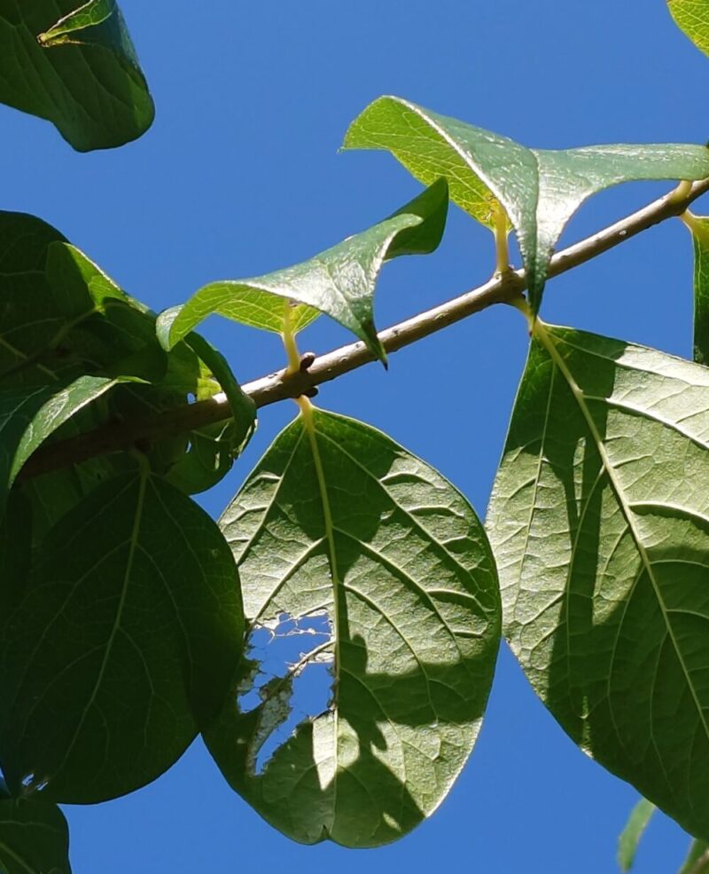 小公園の樹木には「秋の実り」も見られます。と同時に「食欲の秋」・・・虫さんたちが啄ばんだ木の葉を下から眺めると、真っ青な空を背景として、それぞれがまるで芸術作品に見えてきて、「芸術の秋」・・。