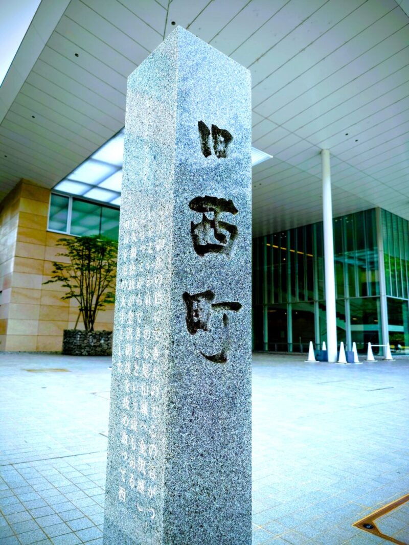 現在の尾山町の一部に、旧町名が「西町」であったことを示す石柱が建っています。ここは、室町時代後期から存在し、かつては金沢城への主要な入り口でした。