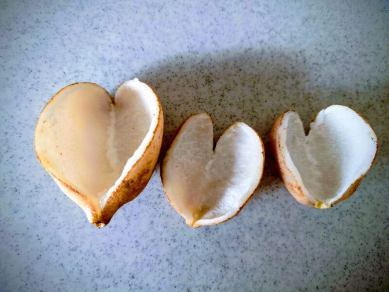 食べ終わった後の皮が「ハート」の形に見えて記念撮影?・・・皮は別途天ぷらにして食することにします。
