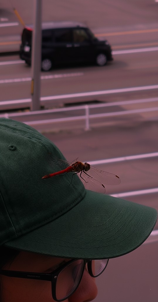光量が少なく、また望遠レンズでの瞬間撮影であったことから、うまく撮れていませんが、トンボはその後、鍔先から帽子の上に移動・・・しばらくしてどこかに飛び立ちました。