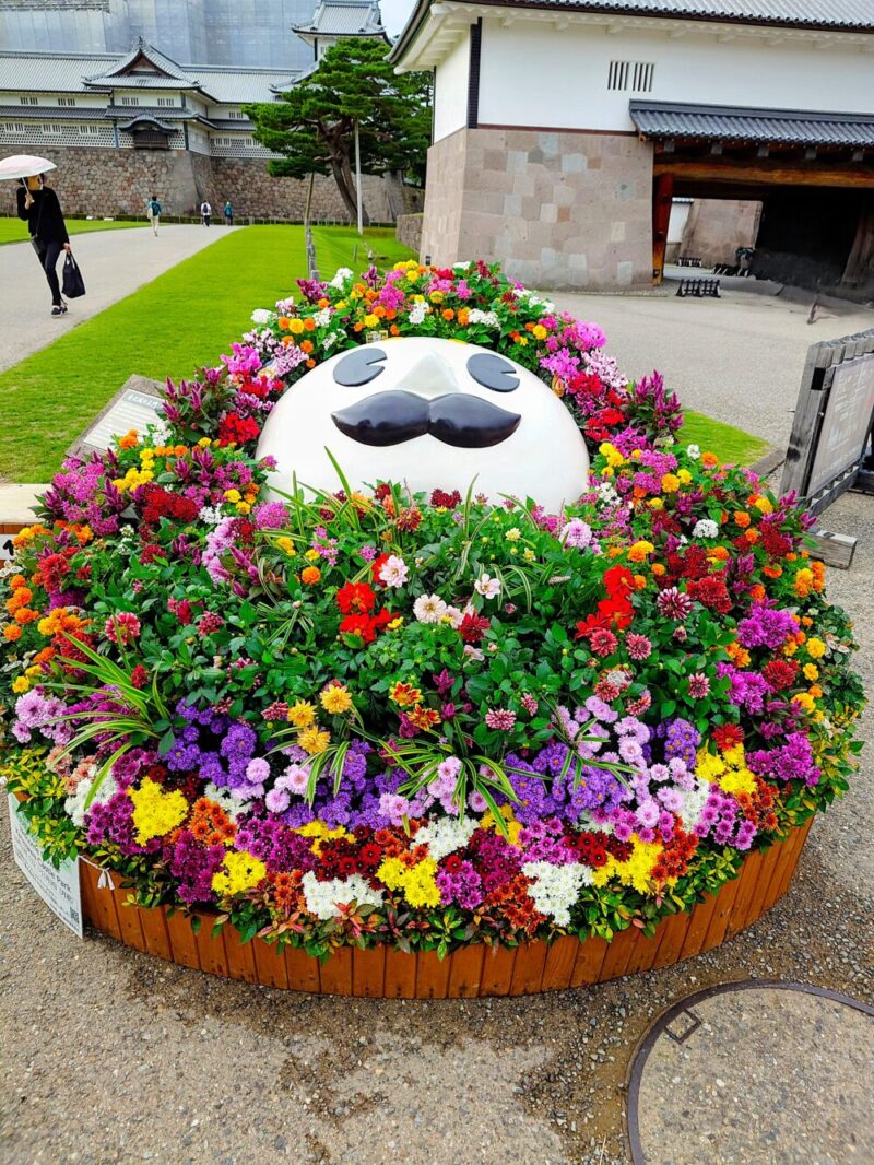 金沢城の三の丸に石川県のゆるキャラ「ひゃくまんさん」が登場しました。秋の花を沢山着けた姿に仕上げ10日の午後に完成しました。