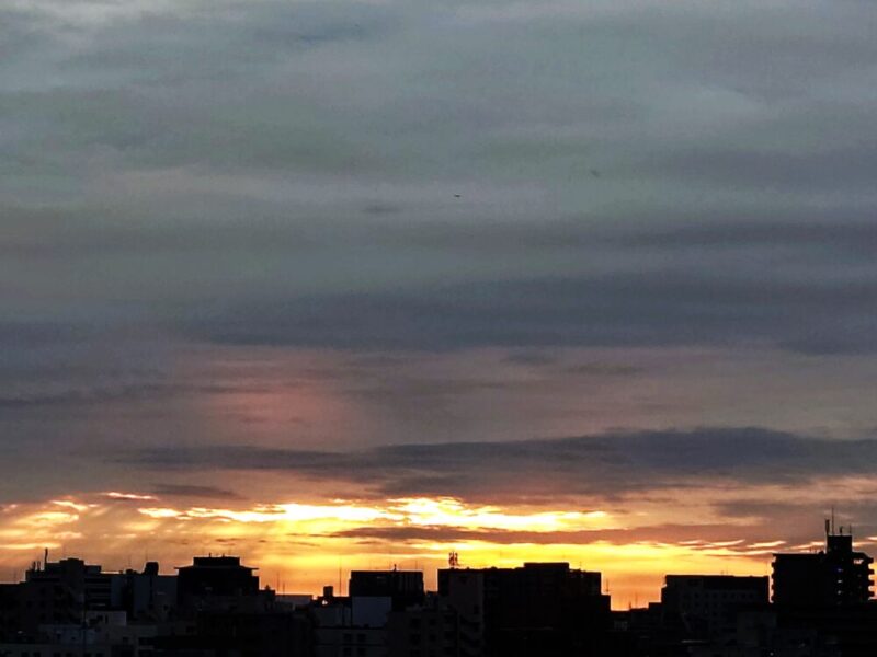 当日の天候は、曇り時折小雨というあいにくの天気でしたが、金沢市内を一望できる高台に登り、日本海に沈む夕陽を眺めたいと思っていたところ黒雲が晴れてつかの間でしたが、黄金に輝く夕陽が射してきました・・・・。