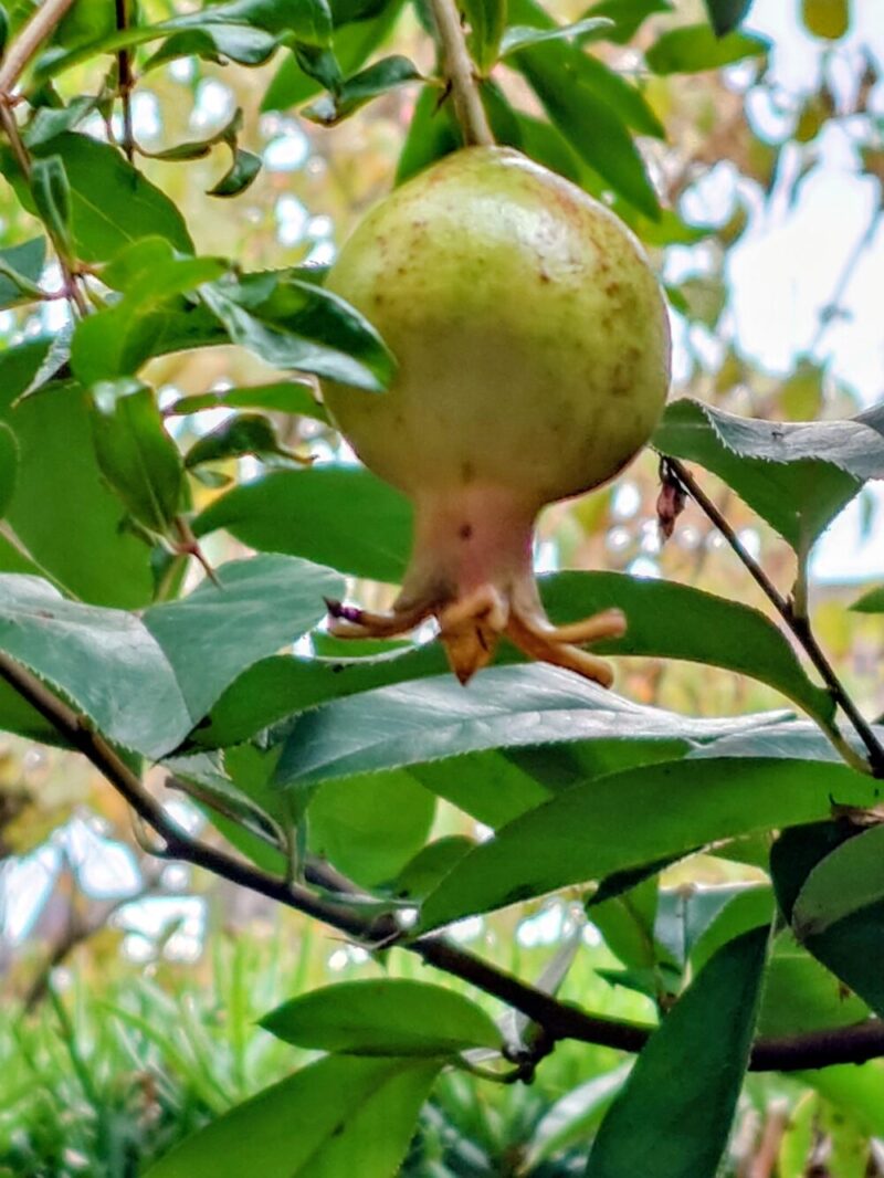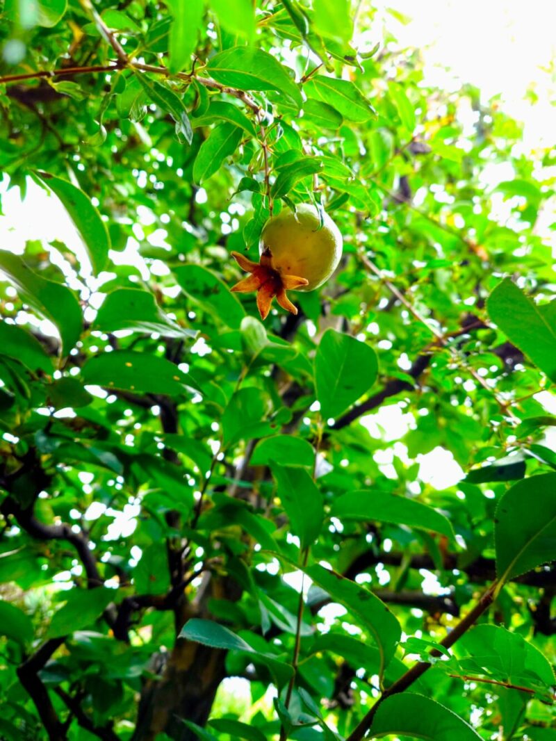 昨年は全く花実を付けなくて寂しく思った「石榴=ざくろ」の実が、今年はいくつかなり、少しずつ赤く色付きました。