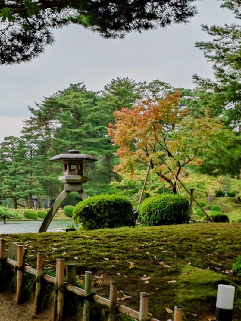 特別名勝「兼六園」の「琴柱灯籠=ことじとうろう」脇に植林の「紅葉」がうっすらとして秋を装うかのような風景を魅せてくれ始めました。