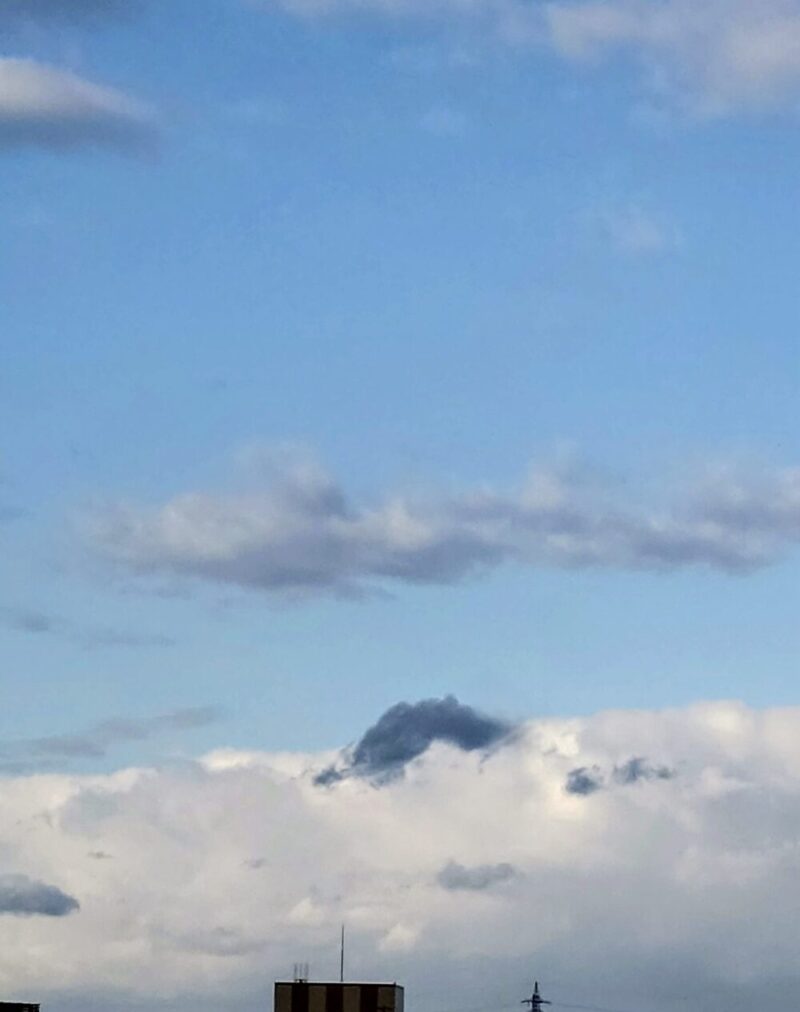 しばらくすると、黒い雲が山の形のように見え始め、やがて「富士山」のように・・・。思わず近くにあったスマホでカメラ撮影しました。
