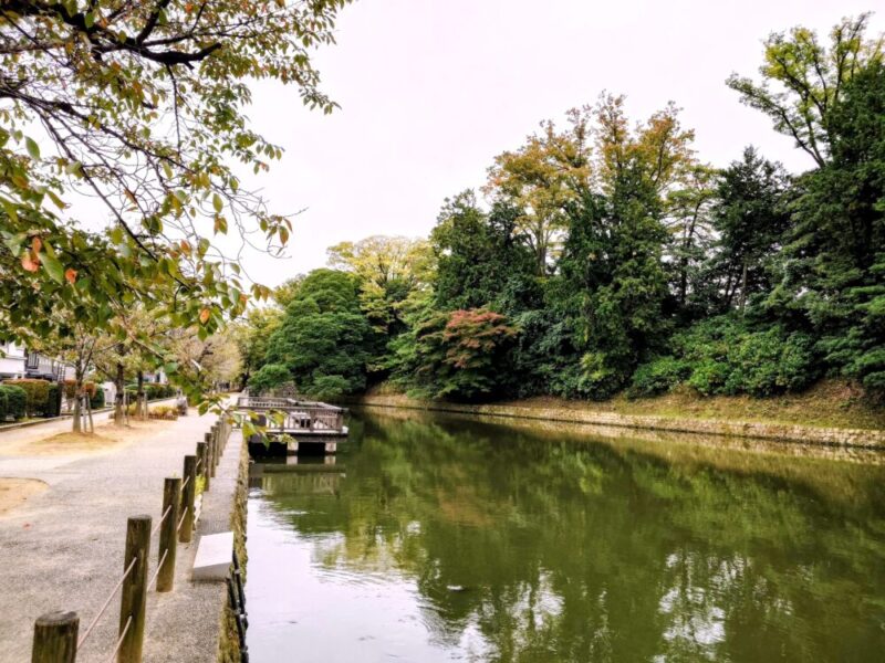 金沢城の大手掘りに、枯れ葉がひらりひらりと落ちています。ここにはたくさんの鯉がいて、歩道を歩く人の足音にも反応するのか、こちらに寄ってきます。