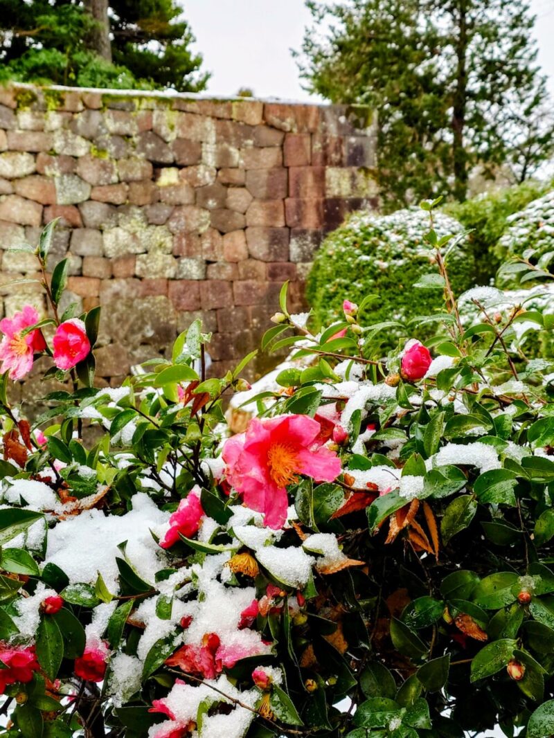 大小のピンクの花が、雪を被った枝葉の緑色と城壁の茶褐色の中にあって、無機質な空間に「紅を差す」といった情景に見えて・・・・。