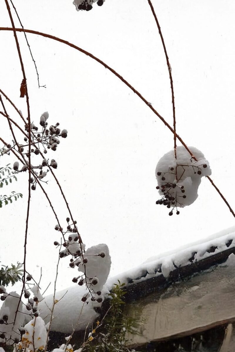 「百日紅の木=サルスベリノキ」に残った枝の先にはたくさんの実が成っていて、「猿は滑る」が、降った雪はしばらく留まります。