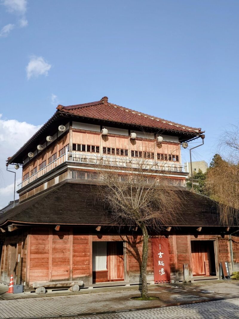写真は「山代温泉古総湯」の全景です。もう一つの「総湯」と呼ばれる浴場は、源泉100%の共同(浴場)施設です。