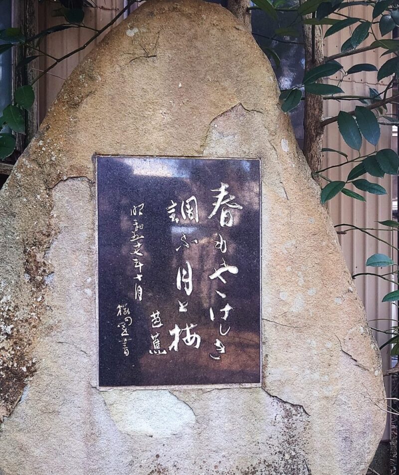 境内の入り口には「狛犬」ならぬ「狛蛙」が設置されており、中に入ると松尾芭蕉公の句が刻まれた碑、「春もやや けしき調ふ 月と梅」が建っていました。