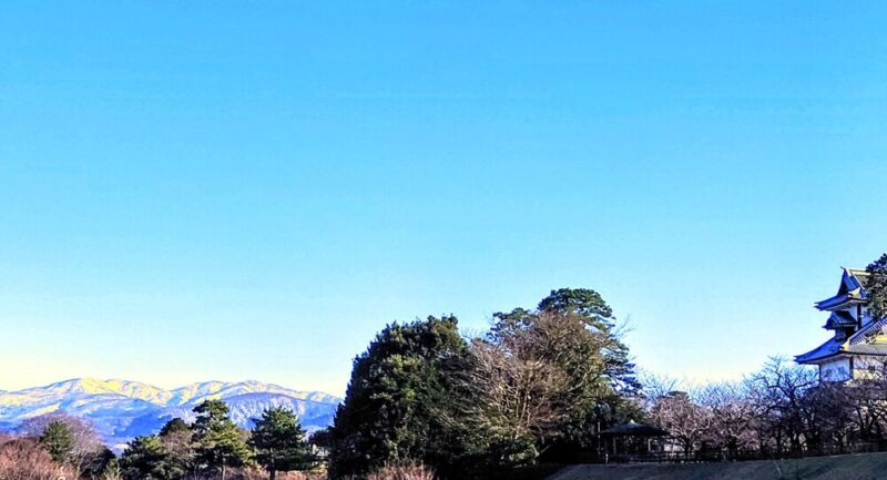 金沢城新丸広場を見下す高台から東の方向を見ると、「卯辰山」「医王山」などまだ雪を被ってはいるものの「城櫓と春の山々」が良く映えてとても綺麗です。