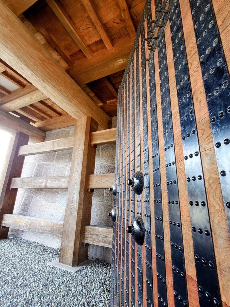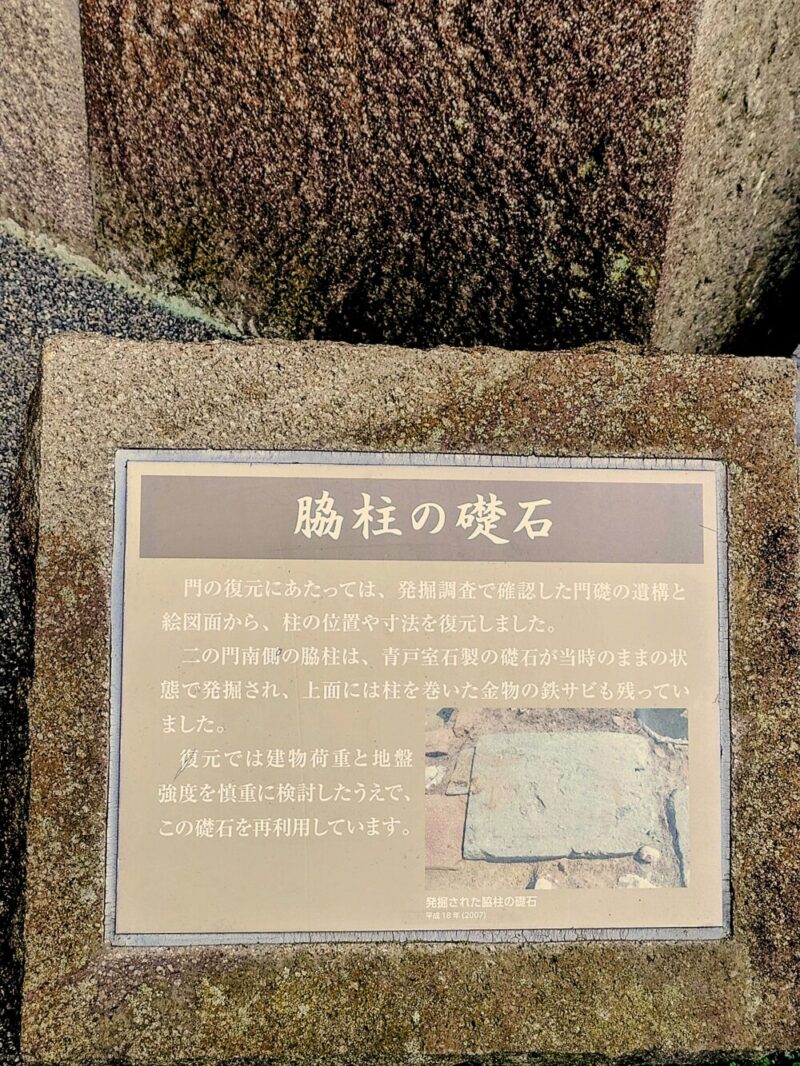この門を復元する際、「脇柱」の礎石が当時のまま発掘されたと記する詳細な説明板が設置されており、「二の門南側の脇柱は、青戸室石製で上面には柱を巻いた金物の鉄サビも残っていました。復元では建物加重と地盤強度を慎重に検討したうえで、この礎石を再利用しました」と書かれています。