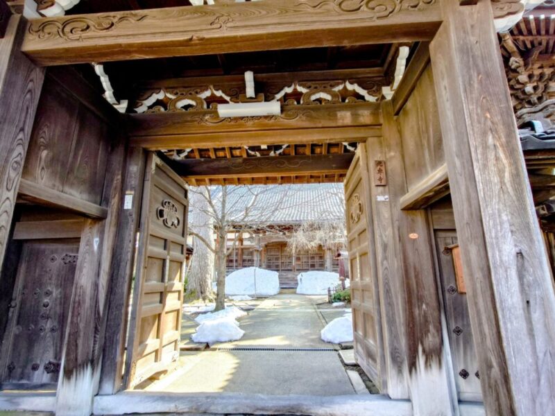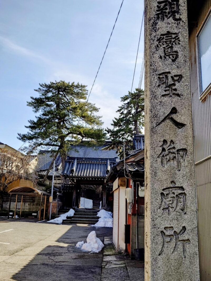 門構えや周囲の松、雪の残り具合が北陸の古寺らしい静謐さが漂っています。今日は朝から青空が見えて、「ぶらり散歩」には最適な一日となりました。