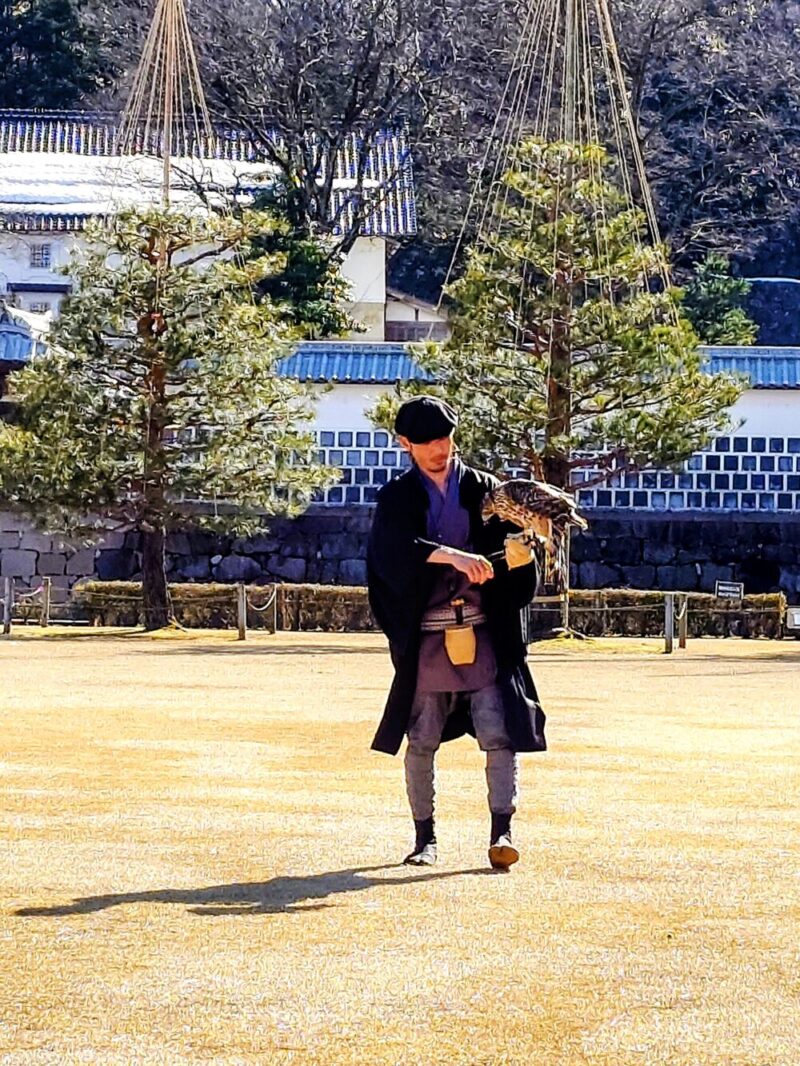 今日2月22日(日)金沢城公園三の丸広場において「鷹匠による放鷹術(ほうようじゅつ)」の実演がありました。(11時~と14時~の2回)