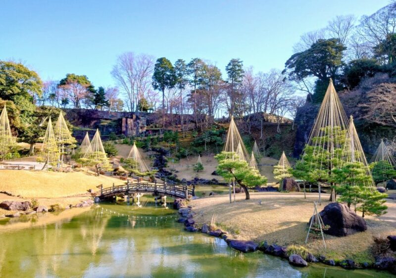 金沢城玉泉院丸庭園は、すっかり晴れた青空がとても綺麗です。池泉回遊式の池に写り込んだ青い色が日に日に色濃くなって、春の訪れを告げています。