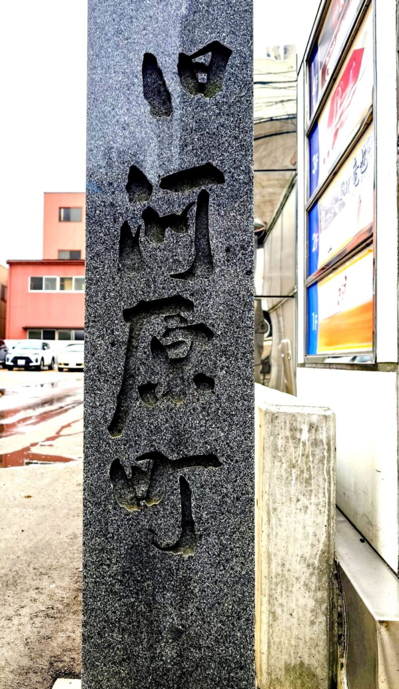 金沢市内の繁華街に「旧町名=旧河原町」を示す標柱が建っていました。剝げ落ちたペンキの白文字がかえって町の歴史や時の流れを感じさせ、とても情緒があります。