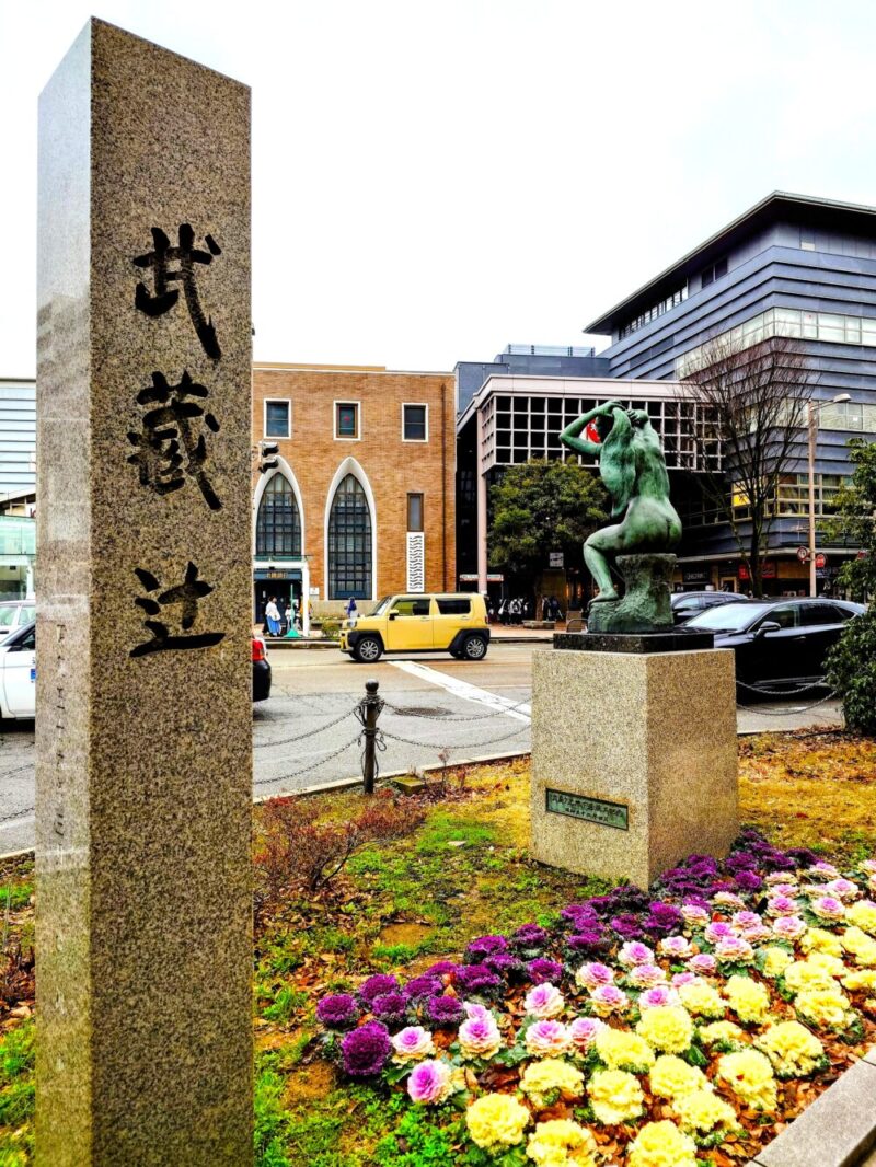 ここ「武蔵辻=ムサシガツジ」は、人気観光スポットのひとつ「近江町市場」「レトロ建築」の「地方銀行」、手前側には「デパート」やホテルの建物が立ち並ぶ繁華街です。
