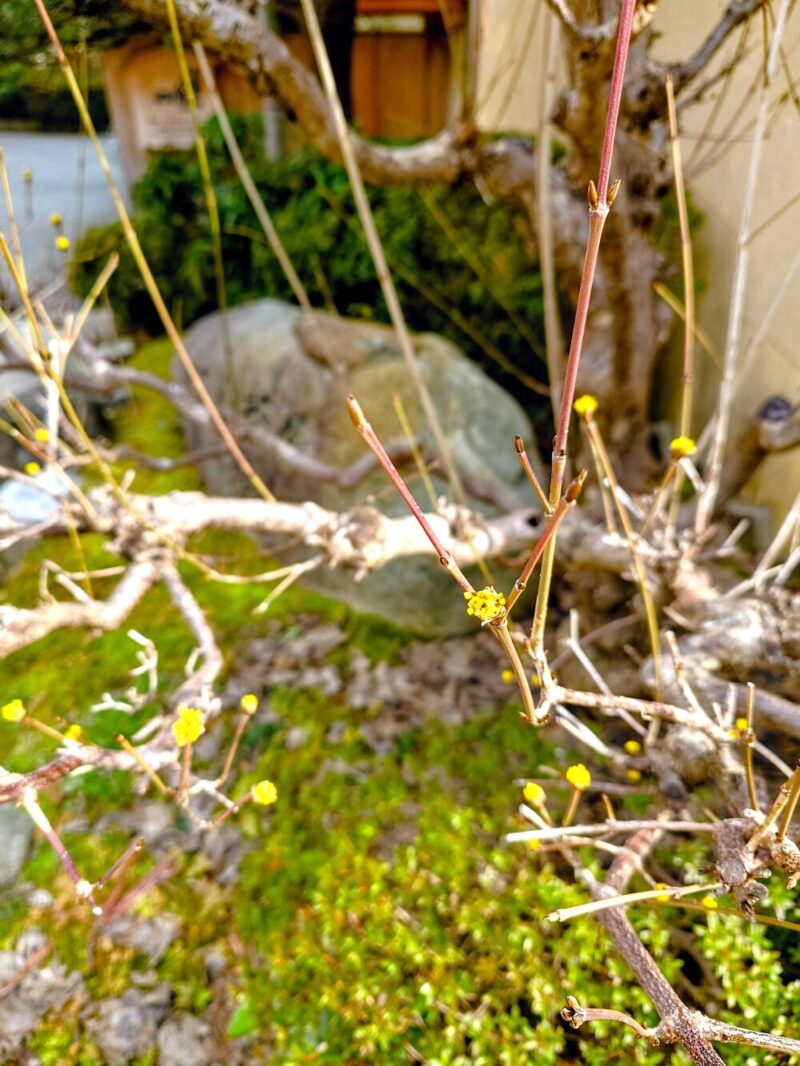 西茶屋の入り口付近にある小公園に「山茱萸=さんしゅゆ」の小さな黄色い花が咲いています。
