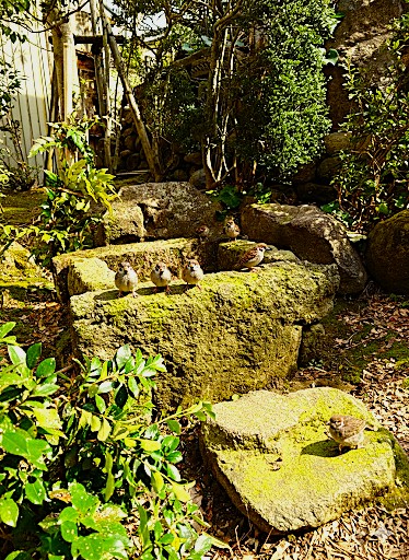 金沢市内の「にし茶屋資料館」中庭にある古井戸の付近に子雀達が集まりました。春の陽光の中、「チュンチュン」と賑やかしく騒いでいます。