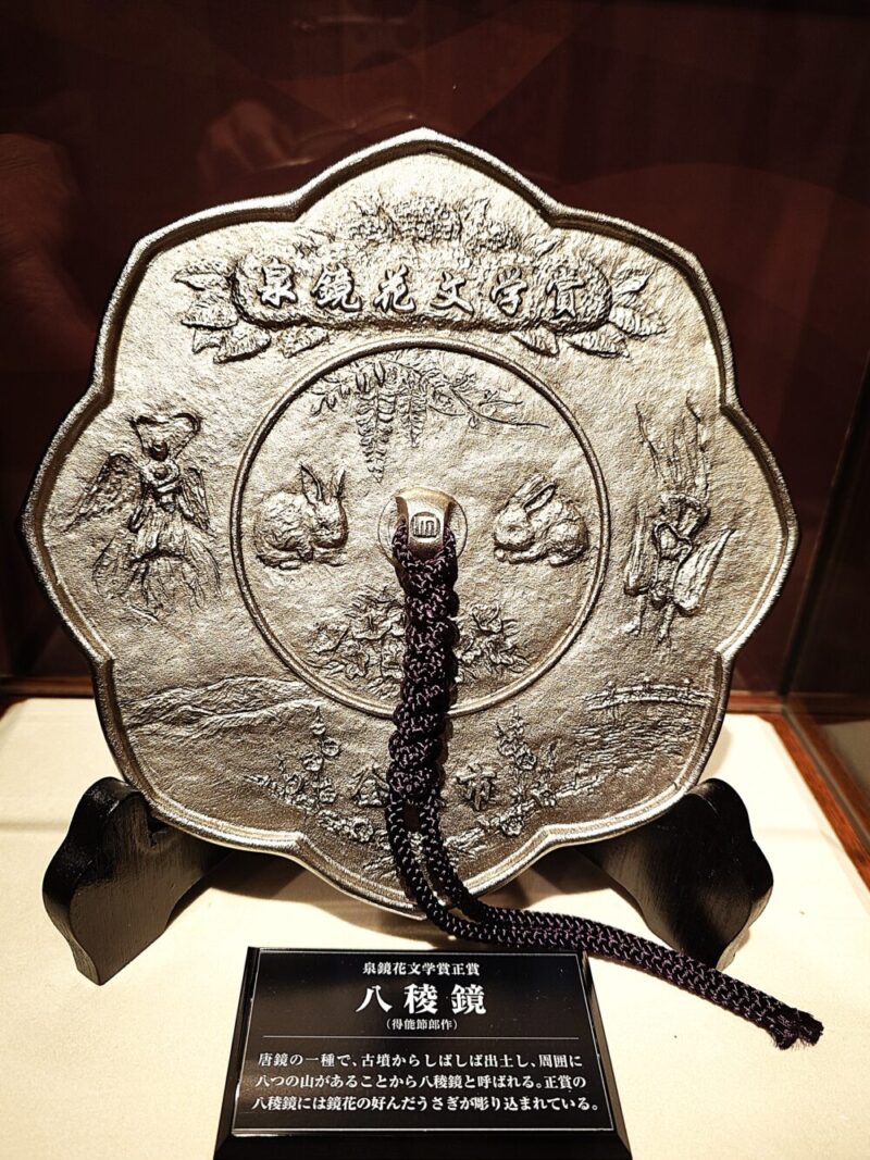 説明板によると「唐鏡の一種で、古墳からしばしば出土し、周囲に八つの山があることから「八稜鏡」と呼ばれる。正賞の「八稜鏡」には鏡花が好んだウサギが彫り込まれている。とされています。