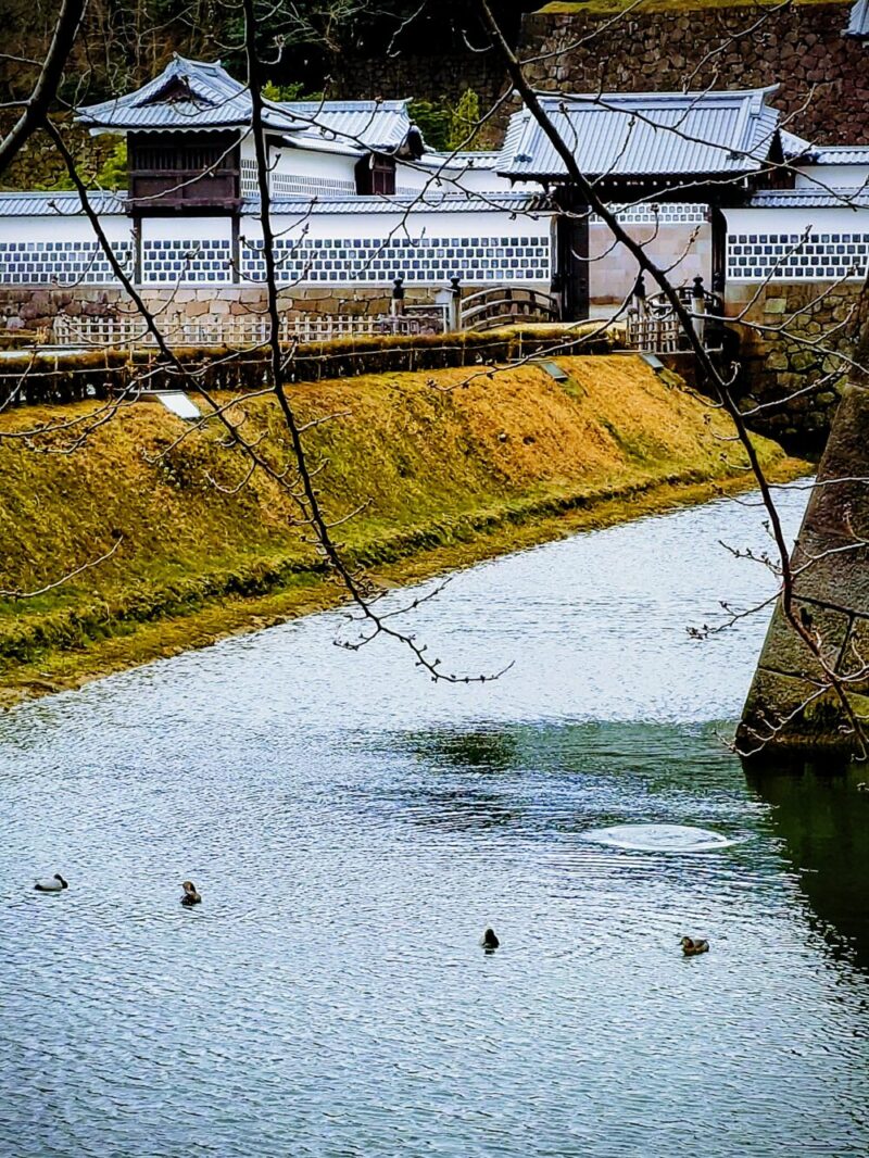 金沢城三の丸と五十間長屋の間にある内堀に、ツガイ数組の鴨がスイスイ泳いだかと思えば急に潜って姿が見えなくなる・・・・その様子を見ていると、とても楽しげな様子でした。