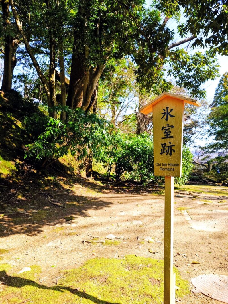 その裏手には「氷室跡」と書かれた立て札がぽつりと建っていますが、特に説明書きも見当たらず、人の気配は感じられません。