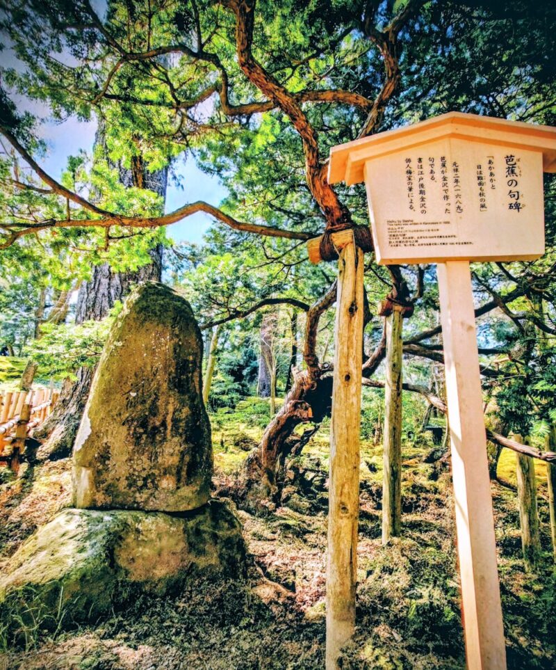 芭蕉の句碑は金沢市内だけでも相当数設置されていますが、園内の句碑には「あかあかと 日は難面(つれなく)も 秋の風」と刻まれています。